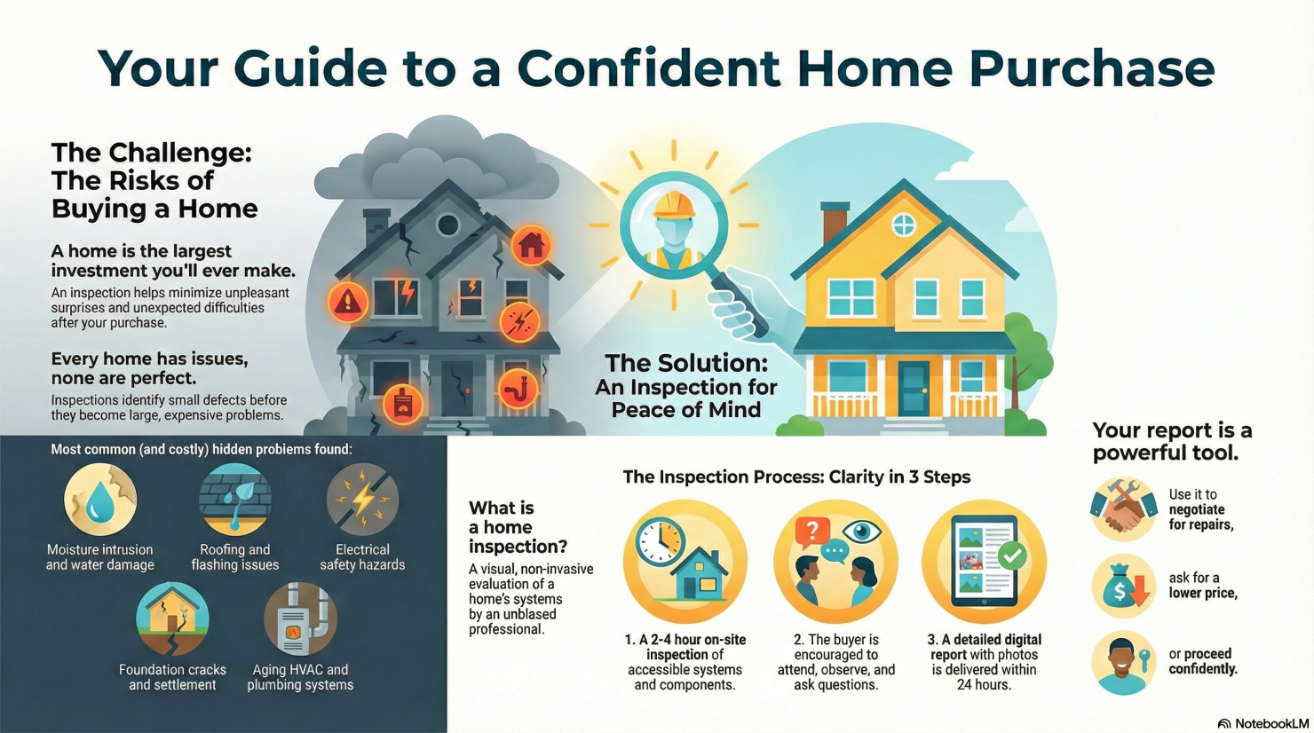 You receive an unbiased, professional evaluation of the home’s major systems and safety-related issues at the time of inspection